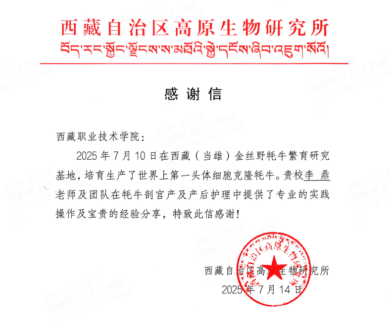 7月14日,西藏自治區(qū)高原生物(wù)研究所向我校發來感謝信,對我(wǒ)校李鼎老師及團隊(duì)在犛牛剖宮產及產(chǎn)後護理中提(tí)供(gòng)的專業實踐操作及經驗分享表示(shì)感謝。【西藏日報】 曆時2年多的科研攻關和實踐創新,2025年7月10日中午12...
