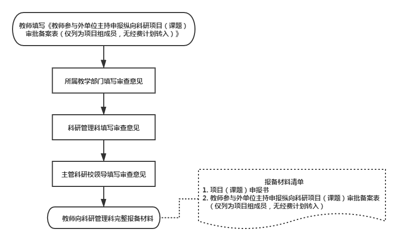 4.外單位牽頭申報,我(wǒ)校教師為項目組成員,無經費計劃轉入的縱向科研項目(課題)審批備案流(liú)程