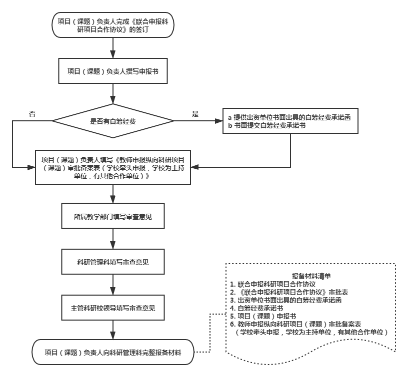 2.學校牽頭申報,學校為主持單位,有其他合作單位,我校教師為項目(課題)負責人的縱向科研項目(課題)審批備案流程