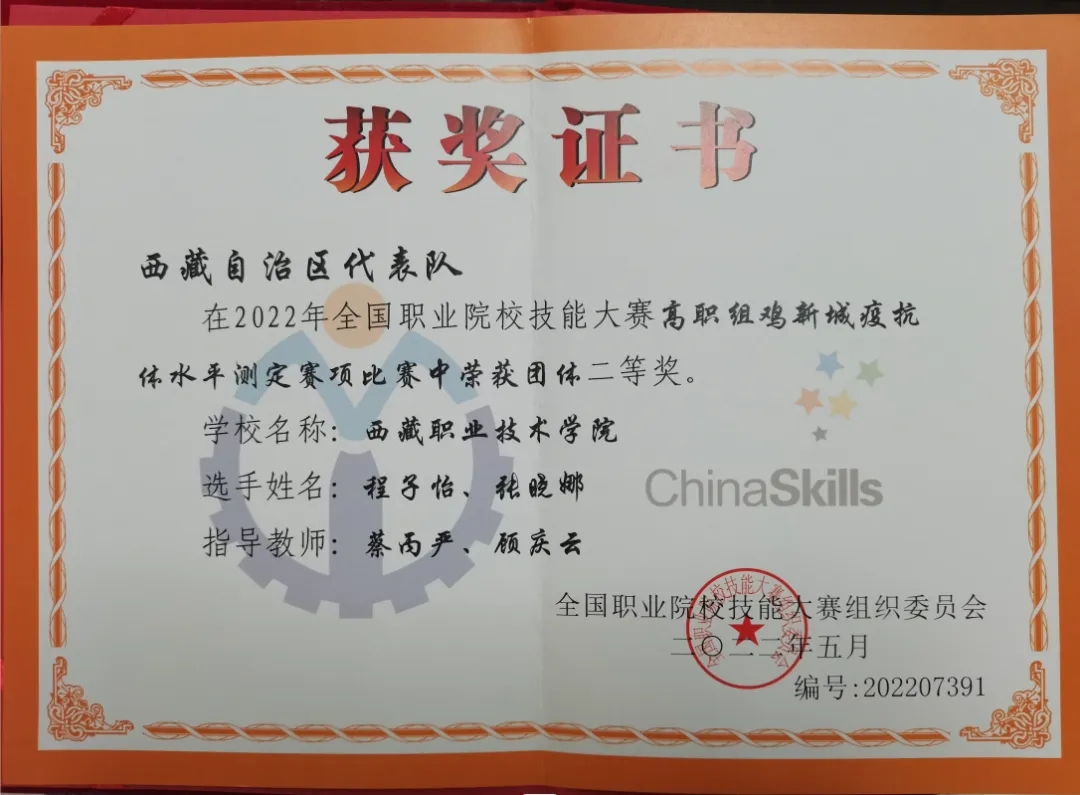 為減少新冠病毒肺炎疫情對技能大賽的影響,他們(men)力爭做到“疫情防控不停(tíng)訓、備賽訓練不鬆(sōng)懈”,在有限的條(tiáo)件下,最大限度提高自身的競技水平。作(zuò)為西藏自(zì)治區參賽隊伍,他們同來自全國51支參賽隊伍同場競技,憑借著紮實的基(jī)本功,他們臨危不亂、緊密協作(zuò),最終榮獲全國(guó)職業院校(xiào)技能大賽高職組雞新城疫(yì)抗體水平(píng)測定團體二等獎(jiǎng)。