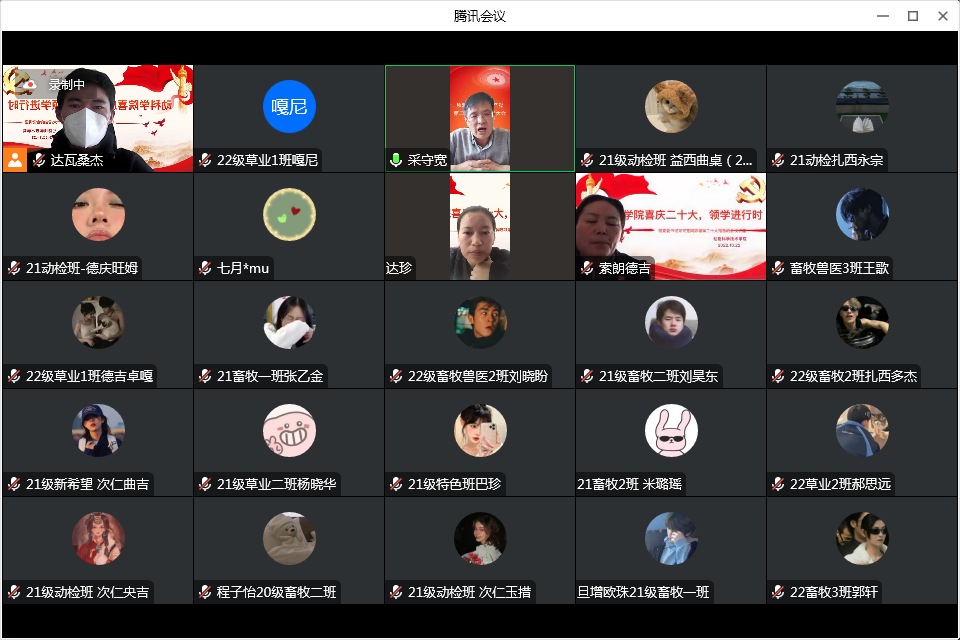 為貫(guàn)徹落(luò)實學院黨委關於學習二十大精神的通知要求,動科學院黨總(zǒng)支積極安(ān)排部署活動方案,迅速在全(quán)院掀起學習熱潮。2022年10月22日下午,動科學(xué)院學(xué)生黨支部邀請院黨委書記、副院長采守寬(kuān)同誌開展主題為“喜慶二十大,領學進(jìn)行時(shí)”領(lǐng)學二十大(dà)報告線上專題講座。會議由學院黨總支(zhī)書記(jì)索朗德吉主持,學院全體(tǐ)教職工、學生骨幹、入黨積極分子共286名人員參會。