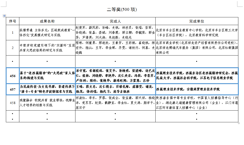 據(jù)悉,國家級教學成果獎(jiǎng)是教育教學(xué)研究和實踐領域的最高獎,是國家實施(shī)科教興國戰略、人才強國戰(zhàn)略和落實立(lì)德樹人根本任務的重要舉措,也(yě)是(shì)對學校教育教學改革(gé)成(chéng)果(guǒ)的階(jiē)段性檢閱和展示,每四年(nián)評(píng)審一次。教育部在各省(區、市)、香港特別行政區、澳門特別行政區認真遴選推薦的(de)基礎上,組織資格審查、專家網絡(luò)評審和專家(jiā)會議評審,共確定2022年職業教育國(guó)家級教學成果獎獎項特等獎2項、一等獎70項、二等獎500項。此次,西藏職業技術學院共有4個項目入選,其中一等獎1項、二等獎(jiǎng)3項,特別(bié)是2個主持成果,是全國為數(shù)不多的獲2個獎項以上(shàng)的職業院校之一。