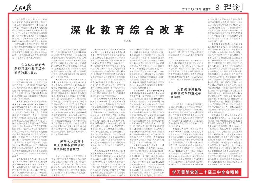 8月21日,《人(rén)民日報》“學習貫徹(chè)黨的二十屆三中全會精神”專欄,刊發教育部黨組書記、部長懷進鵬署名文章《深化教(jiāo)育綜合改革》。