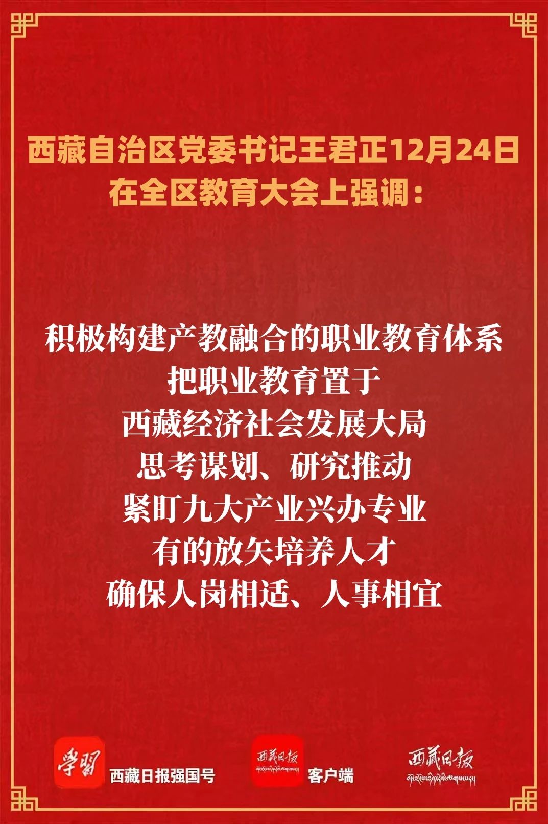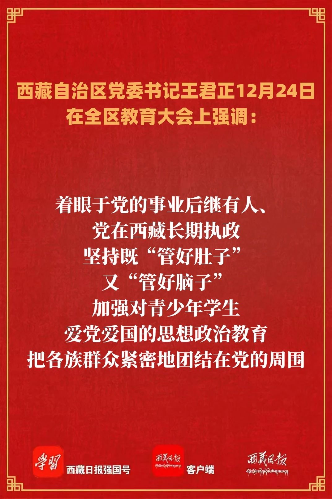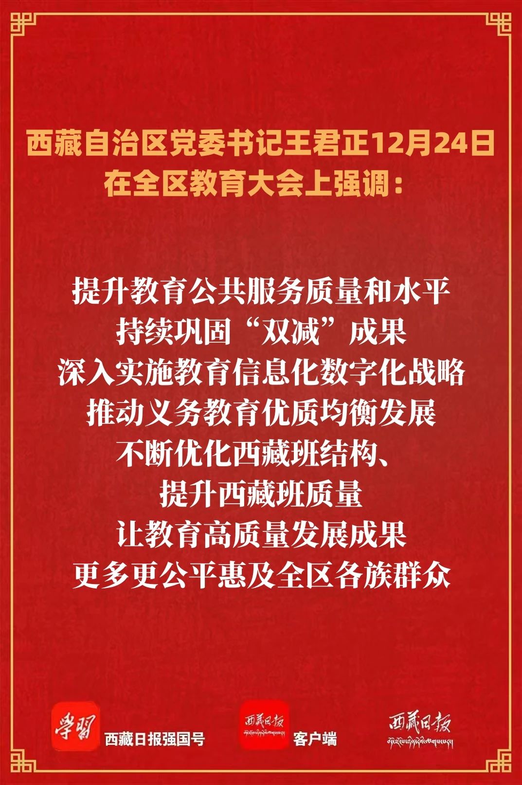 12月24日,全區教育大會在拉薩(sà)召開。自治(zhì)區黨委書記王君正出席並講話。他(tā)強調,要堅(jiān)持以習近平新時代中國特色(sè)社會主義思想為指導,堅決貫徹習近平總書記關於教育工作的重(chóng)要指示精神,貫(guàn)徹落實全國教育大會、全國(guó)高校(xiào)黨的建設工作會議精神,努力辦好人民滿意的教育,推動全區(qū)教育事業高質量發展,為建設社會主義現代化新西藏提供有力支撐。