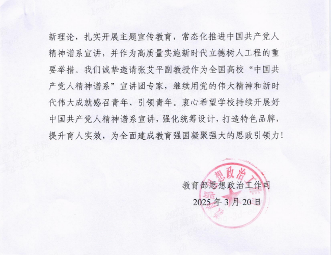 近日,我校收到來自教育部思想(xiǎng)政治工作司的感謝信。信中對我校張艾平副教授擔任全(quán)國高校“中國共(gòng)產黨人精神譜係”宣講團專家並開展示範宣講取得的良好實(shí)效表示(shì)誠摯感謝。