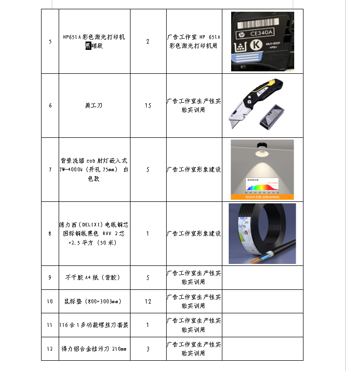 本項目(mù)為“廣告藝術(shù)設計專業教研室為廣告工作室購買設備配套用品采購”項目,招標人為西(xī)藏職業技術學院信息工程學院,資金來源(yuán)為(wéi)西藏職業技術學院信息工程學院(yuàn)工作經費,可支出金額為84730元(yuán)。現對該(gāi)項目的建(jiàn)設進(jìn)行公開詢價招標,具體參數如下: