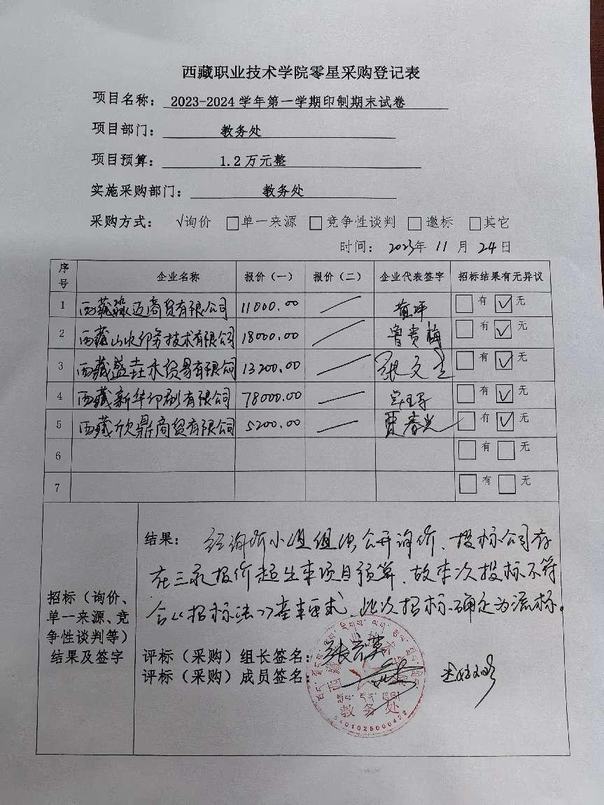 西藏職業(yè)技術學院教務處采用公(gōng)開詢價的方式於(yú)2023年11月21日發布了關於2023-2024學年第(dì)一學期印製期末試卷項目招標公告,按照招投標程序於2023年11月24日上午10:00進行開標,因五家投(tóu)標單位中有三家超出本項(xiàng)目預(yù)算,不符合(hé)《招標(biāo)法》基本要求。故(gù)本次招標無效。