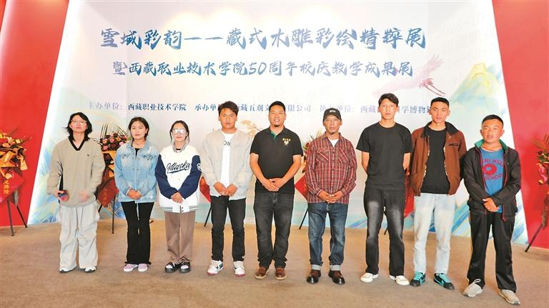 加措和學生在“雪域(yù)彩韻——藏(cáng)式木(mù)雕彩繪精粹展”上合影留念。