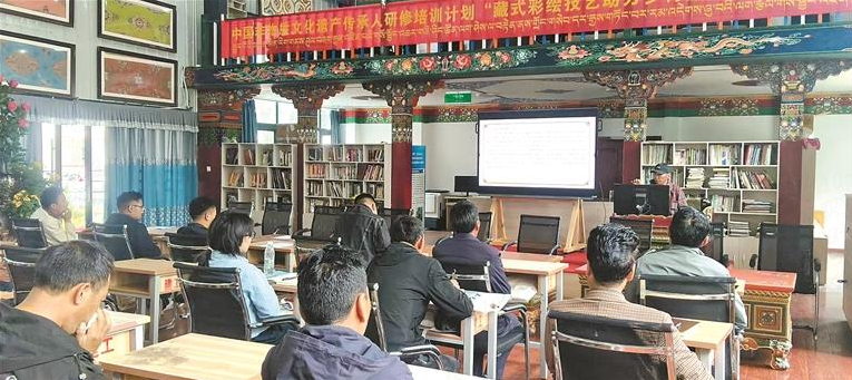 加措在“藏式彩繪技(jì)藝助力鄉村振興技能研修班”中為學員講解傳統(tǒng)藏式木雕和彩繪技(jì)藝。