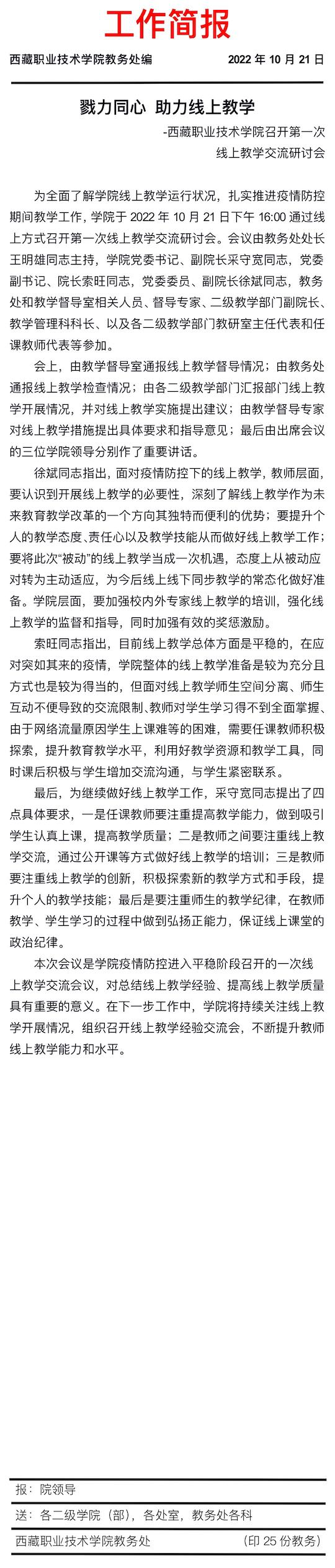 上一條:凝心聚力 附能增值 -西藏職業技術學院召開第二次在線教學交流(liú)研討會 下一條:關於做好當前教學工作相關事宜的通知