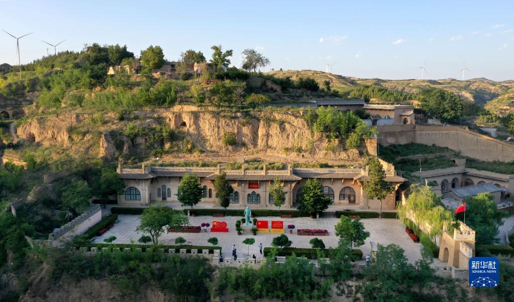 遊人在陝西省榆(yú)林市米脂縣楊家溝革命舊址參(cān)觀(2021年9月10日攝,無人機照片)。新華社記者 陶明 攝